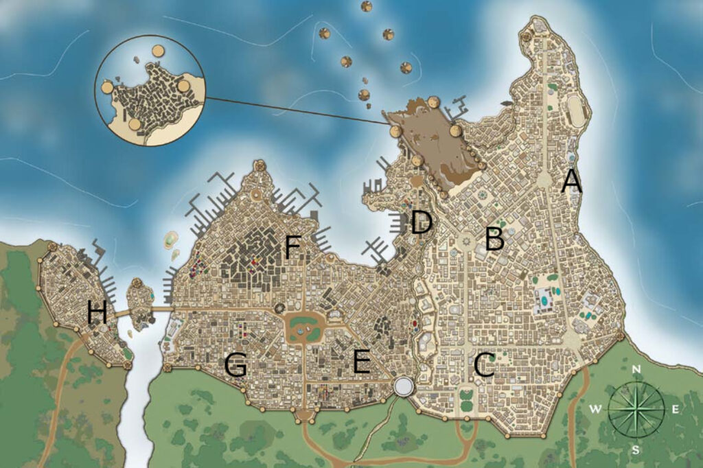 The district of Beacon’s Point is raucous and loud, filled with noisy businesses such as brothels, taverns, and warehouses. While poorly maintained, the district is incredibly important to the life of the city, despite the disdain held for it by the city’s richest citizens.