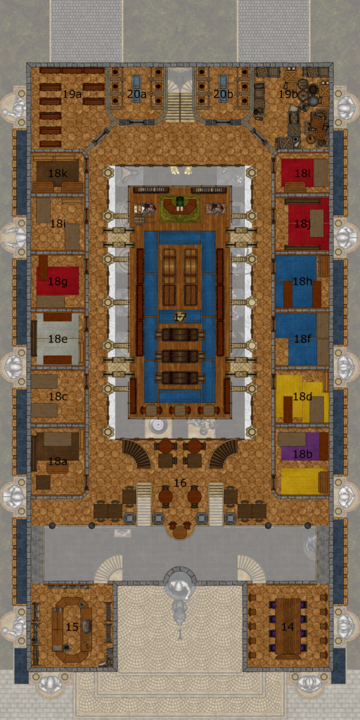 A huge and lavishly decorated table sits in the center of this room. Eight plush, comfortable chairs sit on either side of the table. Under portraits of Venture Captains are other, less comfortable chairs along the walls.
